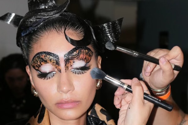 For makeup, Luar partnered with none other than MAC Cosmetics artist Yadim Carranza to bring the designer's vision to life. For the face, Carranza prepped the skin with MAC's Hyper Real Serumizer and MAC Fix+. After this, he massaged in the Face + Body Foundation. Then, concealer blemishes was applied before contouring the cheeks with MAC's Sculpt + Shade palette and highlighted using the Pure White Paintstick. Special appliques were placed onto the brows and eyes that were made from fabric from the collection, taken from Luar's studio.