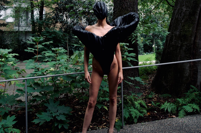Exaggerated shoulders seemed to be inspired by dark nymphs, whereas a chrome hand-like bra's futuristic shape stood out amongst the natural setting. Models wore angular statement-making eyewear, while skin was kept bare and dewy, keeping the focus on the expertly crafted garments. Voluminous sky-high collars transformed models into swan-like creatures. Meanwhile, textural full head masks reinforce the collection's otherworldly approach.