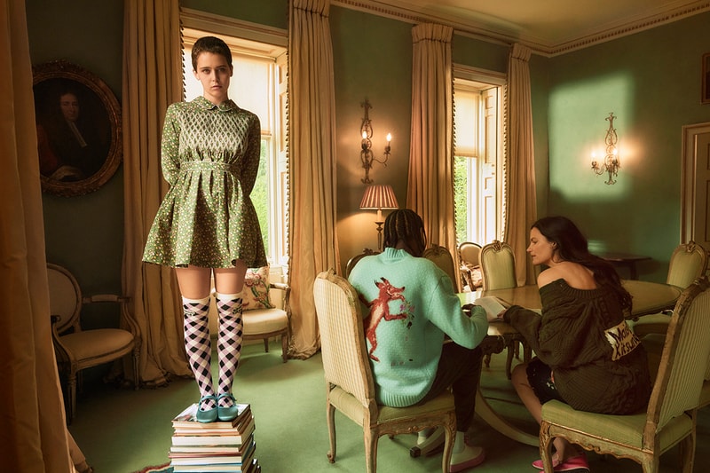 Dizzying floral printed shirts are elevated by buoyant sleeves, while short frocks with voluminous skirts are also covered in an array of botanicals and is accented with an translucent lattice cage across the chest. Classic cardigans exude coziness with their fisherman knit, whereas sea foam green sweaters arrive with motifs of playful deer on the back. A blush pink satin skirt sets itself apart as a collage of vintage black and white photos lay across the front. An elegant jacket trimmed with faux fur is without a doubt a conversation starter as its plush silhouette evokes "main character energy."