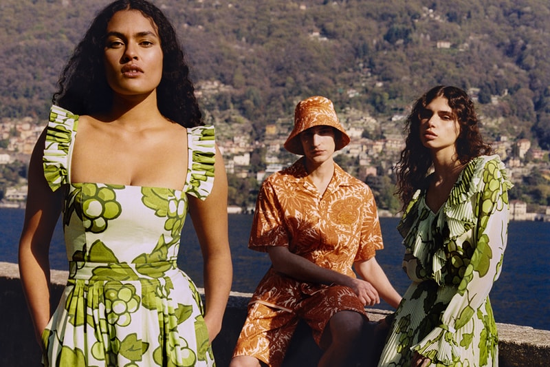 Doused in a vivid color palette of nature-inspired shades, a verdant green hue takes shape in a playful print bursting with ripe berries. The ultimate summer dress arrives in the juicy motif, donning frilled shoulders, a chest-barking neckline and pockets. Meanwhile, a floor-sweeping frock in the same print evokes a languid sense of intrigue with the addition of a ruffled neckline and cuffs. A breezy wrap with a contrasting polka dot opening instantly captures the highly-coveted feeling of a vacation, joining paisley one-piece of the same shade. Elsewhere, burnt orange palm trees sway on short-sleeved t-shirts, Bermuda shorts and bucket hats for chic protection from the sun, whereas a blouse with voluminous sleeves and dramatic collar steals the show during summer nights.