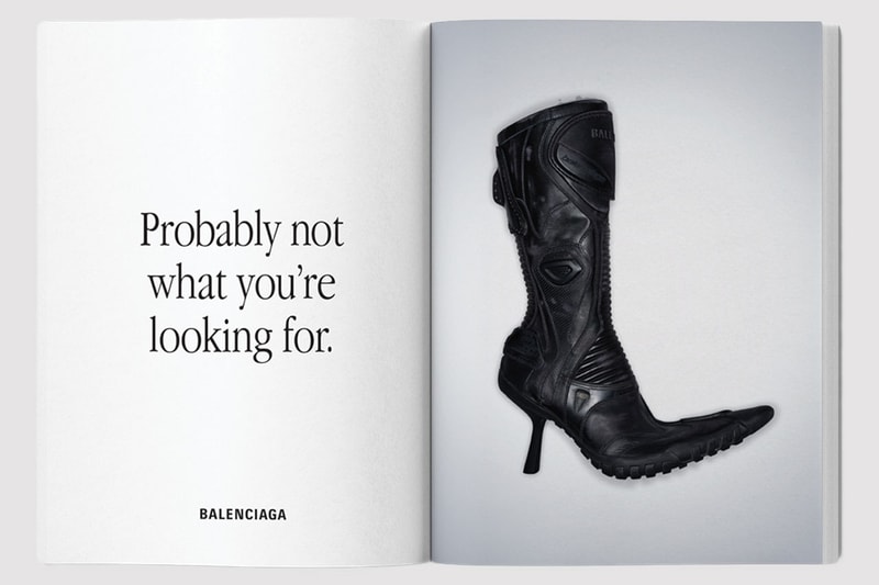 In line with a new, more self-aware approach and tongue-in-cheek taste, the campaign aims to celebrate distinctive Balenciaga silhouettes and designs in a new context. Large-scale images of pointed boots, logo bags, oversized jackets and leather trousers are laid out alongside taglines like "It's different," "No blabla" and "Probably not what you're looking for," aiming to poke fun at the brand, letting the world know it's not taking itself too seriously.