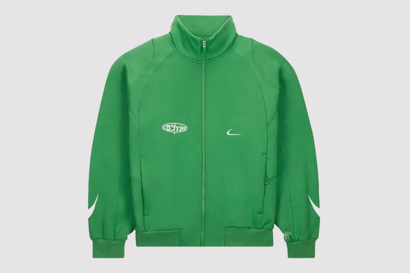 Elsewhere, the range includes track jackets and matching bottoms in hues of green and black, featuring graffiti-inspired co-branding and crafted from heavyweight fleece fabric. Water-repellent track pants boast wide-leg cuts that can be adjusted via functional cinch cords at both the knee and hem, while black leggings and a checkered green cap round out the collaborative offering.