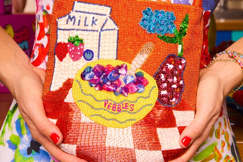 A kid at heart, Korn wants to remind us of the little things that used to make our hearts sing: Sunday morning cartoons, after-school snacks and the sheer wonder of expressing yourself without confines. That child-like excitement is her biggest inspiration and a tool she pulls from with every new accessory design or collaboration. Her latest collab with nostalgic cereal brand, PEBBLES, hit me right in the heartstrings. The beaded bag, which features a motif of a sugary-sweet bowl of cereal, immediately transported me back to early mornings spent watching Looney Tunes, over a bowl of cereal, before school. And, of course, that’s exactly Korn’s goal: to remind us all of simpler times and to instill even the most mundane moments with a sense of sheer happiness. Hypebae connected with Korn to discuss tapping into her inner child and the new, adorable collab.
