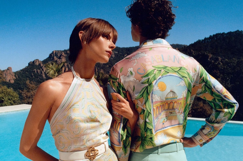 The collection includes a range of menswear and womenswear styles, each adorned with Casablanca's luxurious touch and vibrant color palette. Belted dresses, sheer ombre tops and towelling sets arrive in hues of green, blue, yellow and orange, mimicking the vibrancy of the French riviera.