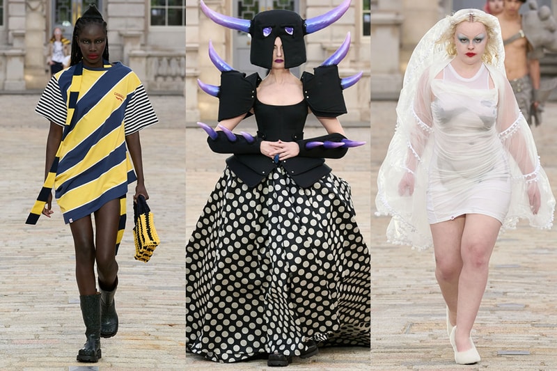 See: Exploring the concept of "queer time," the showcase presented a slew of "characters" who make up the Charles Jeffrey LOVERBOY world. From striped pyjamas to banana boots, the collection offered a playful range of punk-inspired silhouettes, transitioning from army and sailor-inspired uniforms and wedding dresses to deconstructed knitwear and a Converse collaboration.