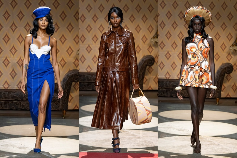 SEE: Picture a '60s Barbie doll -- only with a bit less pink. Think go-go boots, retro-patterned outfits and even an umbrella as an accessory. The collection featured tan and beige mini-pleated skirts, PVC bottoms and three-quarter-length culottes. Standouts included tailored suits, print-belted dresses and matching PVC waistcoats and skirts. Jourdan Dunn graced the runway in a striking royal blue bustier dress, hugging her silhouette with a high slit, topped off with a matching hat.