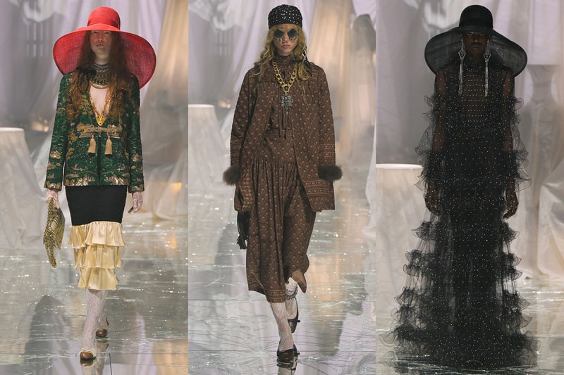 SEE: Extravagance underpinned the collection, presenting a slew of embroidered gowns, embellished tops and layered ruffles. Models walked down the runway with oversized costume-style jewelry, head coverings, large hats and mirrored sunglasses, while beauty looks saw chain detailing appear as nose rings and lip accessories. A jewel-toned color palette of purple, forest green, baby pink and red and gold was showcased, created through clashing prints, lots of layering and lace accessories.