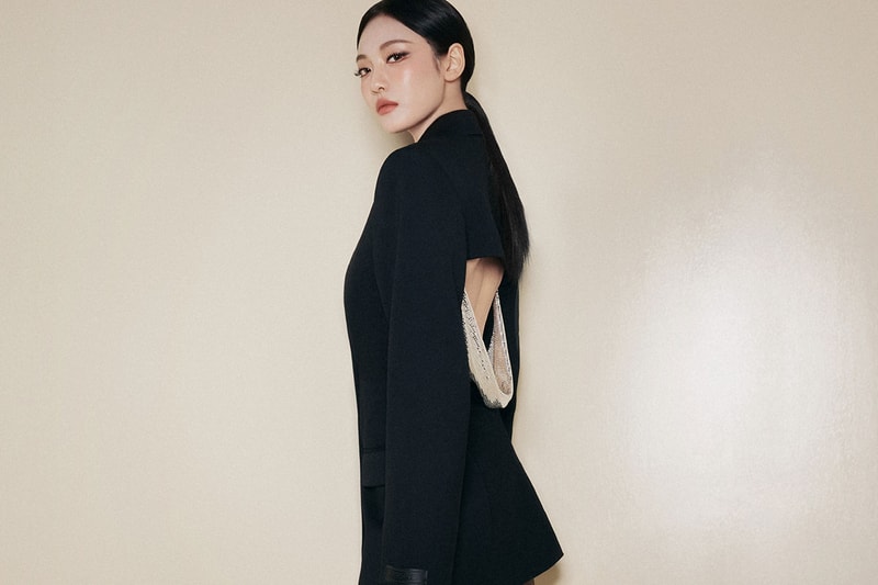 NINGNING is captured in standout styles from the collection, pictured wearing a tailored jacket with metal mesh plus cozy knitwear with Dalmatian patterns, complete with both the Protea and Kleio bags.
