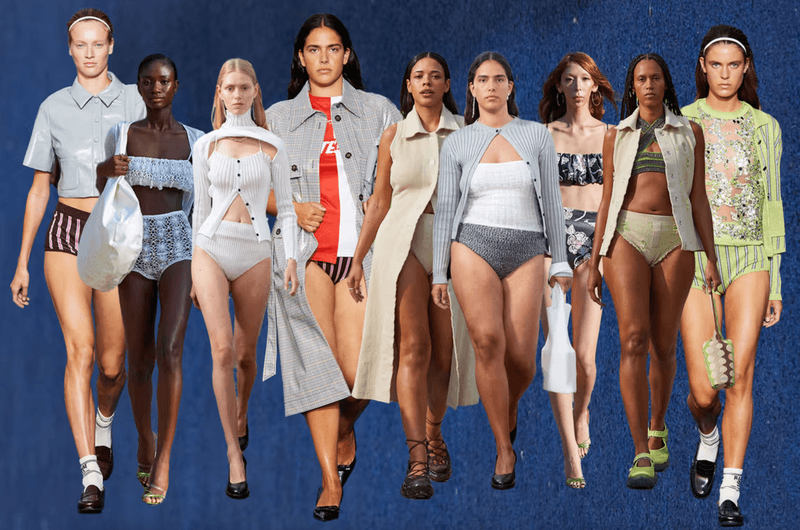 It feels somewhat impossible to talk about micro shorts and hot pants without talking about Miu Miu, so here goes. The brand contributed to the rise of the micro silhouette back in October 2021, debuting its micro miniskirts on the runway. Not long after, Diesel debuted its controversial belt skirt, appearing on the runway in February 2022. These two silhouettes seemingly paved the way for an even shorter hemline to take over, resulting in a slew of hot pants and undies to follow.