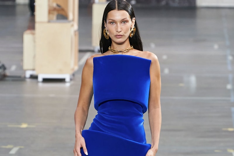 "Get your iPhones ready; the vibes are about to be immaculate," the emcee announces as Bella Hadid opens the school gym-themed stage in an electric blue velour dress with matching knee-high boots. A star-studded cast featuring Joan Smalls, Honey Dijon and Amber Valletta follow in dresses with inside-out seams and maxi-length coats. Contrasting the toned-down blue and gray colors are patterns such as houndstooth check on bucket hats and tops, as well as a multicolored abstract print on shirts.