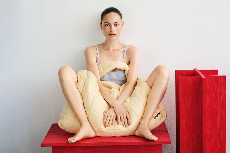 Celebrating the beauty of the body, the brand's cofounders Awa Malina Stelter and Stephanie Gundelach created versatile garments that are both classic and sporty. The ribbed Pauline dress is highlighted with a wavy neckline, while more knitwear pieces arrive in the form of asymmetrical tops, a cardigan and a unisex neck gaiter. Glossy textures take over boxy blazers and matching trousers, as well as padded jackets and coats. The range is complete with printed mesh designs and an oversized quilted bag in pastel yellow.