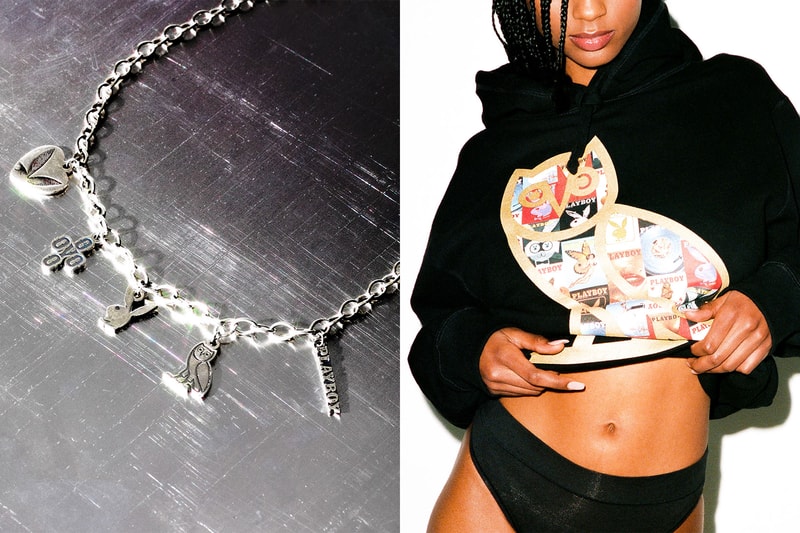 Titled "Symbols of Prestige," the collaboration features apparel and accessories branded with OVO's signature owl motif fused with Playboy's branding. The logos are printed on crewneck sweaters, while Playboy's iconic covers are printed on hoodies and T-shirts. Elsewhere, knit sweaters are emblazoned with repeated rabbit and owl patterns, which are also spotted on the accessories range comprised of boxer shorts, bucket hats, caps and more. The collection is complete with a silver charm necklace, Bicycle playing cards and a charm keychain.