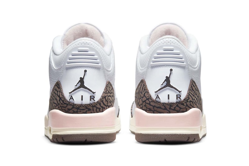 Similar to the "Mocha," the "Dark Mocha" combines a white leather upper with chocolate brown elephant print overlays on the toe and heel. The newer iteration adds touches of "Atmosphere" pink on the eyelets, midsole and Jumpman tongue embroidery.
