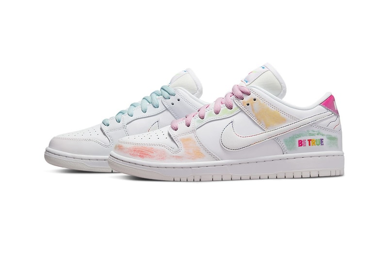 Nike continues its tradition of Pride Month releases with a newly revealed Dunk Low. The sneaker features a mostly white leather upper with rainbow topstitching, "BE TRUE" text on the heel and mismatch laces.