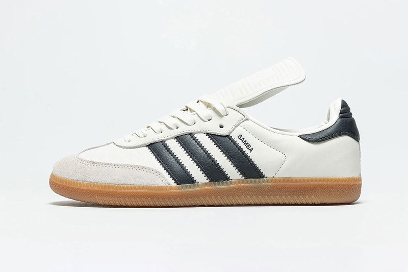 As previewed earlier, the co-created Samba arrives in a simple makeup, featuring a white leather base. A neutral suede overlay is added to the toe box, while topstitched details highlight the Three Stripes on each side. "SAMBA" and "HUMANRACE" branding replace the usual "SAMBA" text on the laterals, while more contrast is added on the black heel tab. Standing out from the design is the exaggerated, elongated tongue, which features an embossed adidas logo. The shoes are complete with gum mid and outsoles.