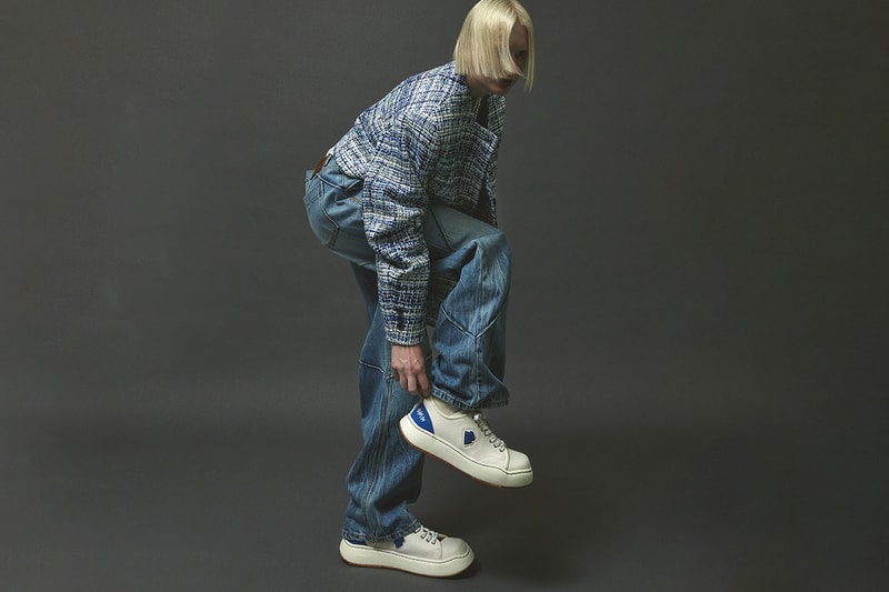 The label's first footwear drop delivers four options. Leading the pack is the "BAUS," a classic German army sneaker, painted in hues of soft cream and gray with splashes of bright blue. Elsewhere, the "KHALIF" stands tall with its high-top structure and retro-inspired straps, delivering extra functionality and style. Meanwhile, the "CANV" offers a canvas-covered sneaker, welcoming an erratic exaggerated eyelet punching detail. The "LAD" slip-on may bear a laid-back and relaxed shape, but its two-tone colorway and zigzag stitching reveals a careful attention to detail and rebellious spirit.