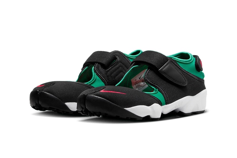 Nike is set to reintroduce the Air Rift silhouette in its original black and green colorway, just in time for the summer season. The sneaker, which was inspired by Kenyan barefoot runners and named after the Great Rift Valley, a geographic rift that runs from Lebanon to Mozambique, is known for its unique shoe/sandal design equipped with tabi toes, making it one of the most visually distinct options in Nike's lineup.