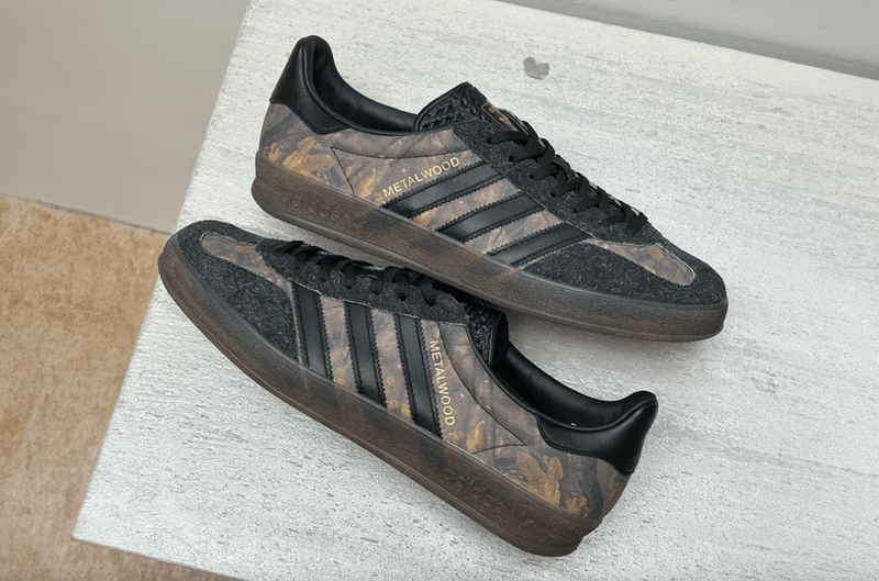 First debuted at Paris Fashion Week in June, Cole Young's Metalwood Studio has reinvented the adidas Gazelle silhouette. Showcased at an event with adidas Skateboarding, the new kicks feature a brown camouflage base and matching sock-liner, complete with rough, black/grey suede overlays across the forefoot.