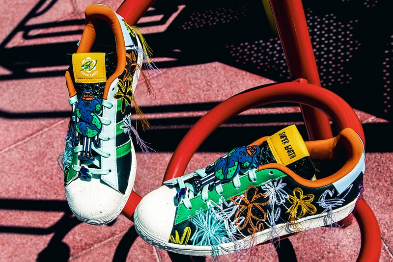 Similar to the 2020 white iteration, the newest version features a black leather upper embroidered with colorful flowers that come with uncut strings. Elsewhere, hits of green, baby blue, orange and yellow are found on the eyestays and heels. Wotherspoon’s SUPEREARTH figures on the laces add a unique touch to the footwear style's overall look. The classic shell toes and white midsoles and outsoles round off the footwear style.