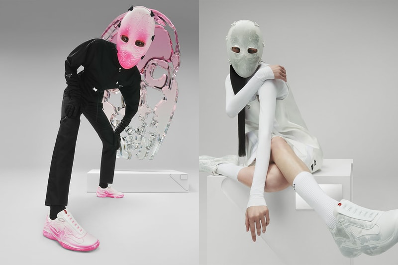 The collaboration features four styles with names inspired from the world of music. "ATT4CK" comes with molded spikes and is given a three-dimensional effect with crinkled spray paint, while "D3CAY" is given a distressed look with multiple layers of colors. "SUST4IN" is spray-painted with two different shades of the same color for a tonal look, and "REL3ASE" is a bicolor design with two contrasting colors sprayed on each side of the shoe. All four models feature Cass' name repeatedly printed on the lacing system, and Prada's iconic red stripe runs down the rear.