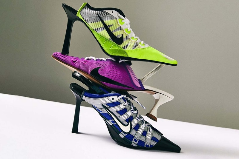 Inspired by Formula 1 cars, the product range includes mule, slingback and kitten heel styles blending Nike uppers with patent leather elements. Each pair is one-of-a-kind with prices ranging from $680 USD to $769 USD.