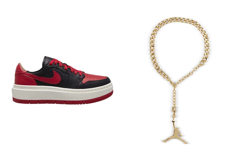 The model starts with an AJ1 Low build up top, constructed in smooth leather. Traditional "bred" colorblocking covers the silhouette, while the interior features cork insoles bearing a Michael Jordan 1985 Dunk Contest graphic. Adding to the lifestyle sneaker is a gold Cuban link anklet with a Jumpman pendant, calling out to MJ's floating chains in the iconic pic.