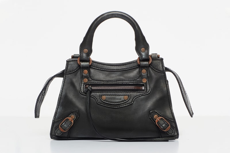 Made of black calfskin leather, the bag's handle and seaming is faded, resulting in a worn appearance that points to the accessory's eventual intended use. The shape of the purse is more relaxed than the typical Neo Classic, contributing to its well-loved look. Rusted metal accents including studs at the front zippered pocket and buckles at the lower corners complete the style. "The update is meant to be worn forever, becoming organically distressed over time while its leather interior stays strong and functional," Balenciaga said of the Neo Classic Used in a press release.