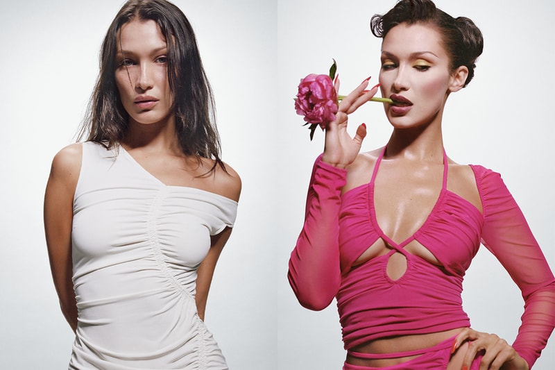 Inspired by post-pandemic fashion, Chong created silhouettes dressed in rich hues blended with softened textures. "After what feels like a lifetime spent indoors, I was inspired to design a modern approach to dressing -- strong, feminine styles but always soft and relaxed at the same time," the designer explained. Hadid is seen in a white off-shoulder dress, a hot pink and black cut-out dress, and a long-sleeve bustier top styled with a pastel purple skirt.